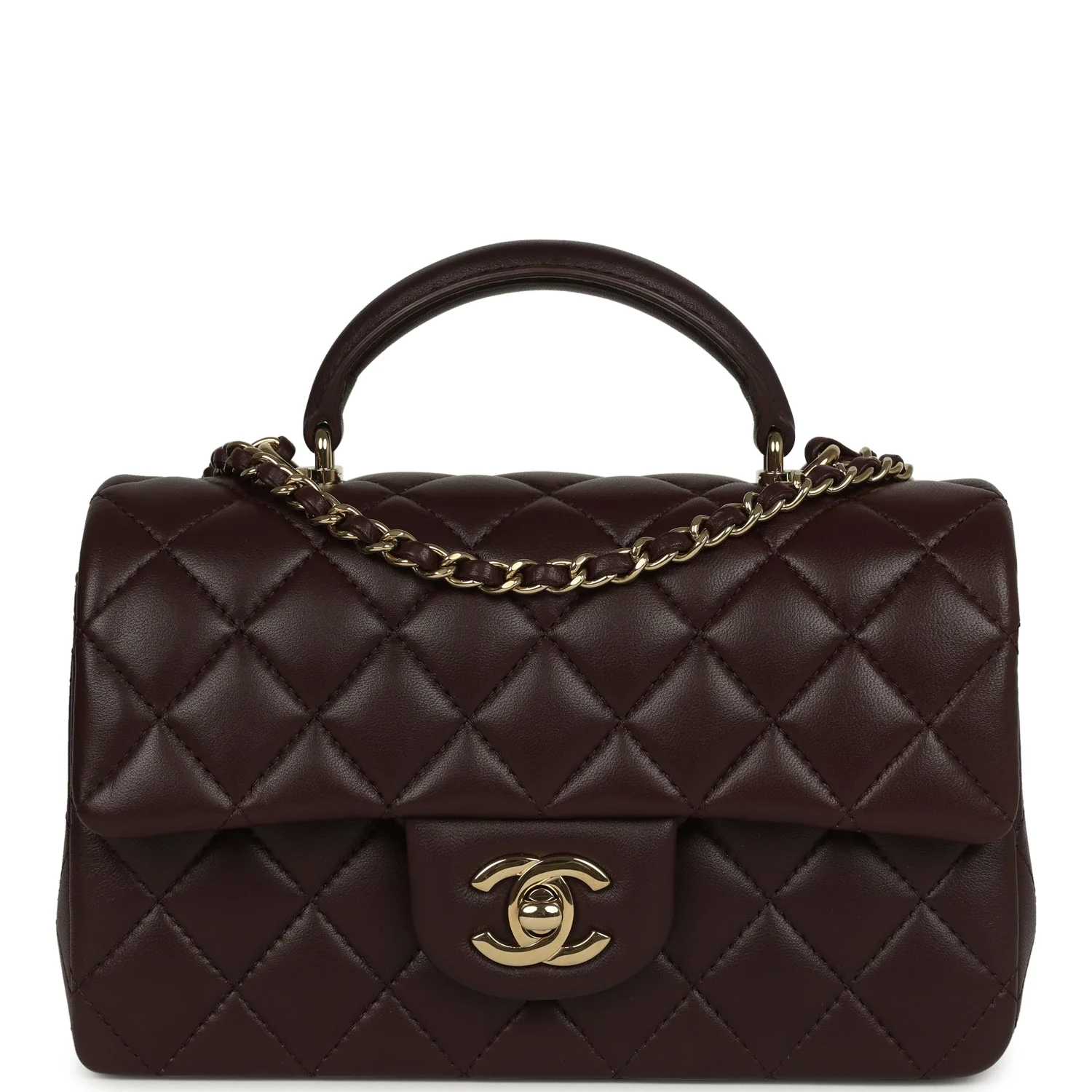 Chanel Mini Rectangular Flap Bag with Top Handle Dark Brown Lambskin Light Gold Hardware