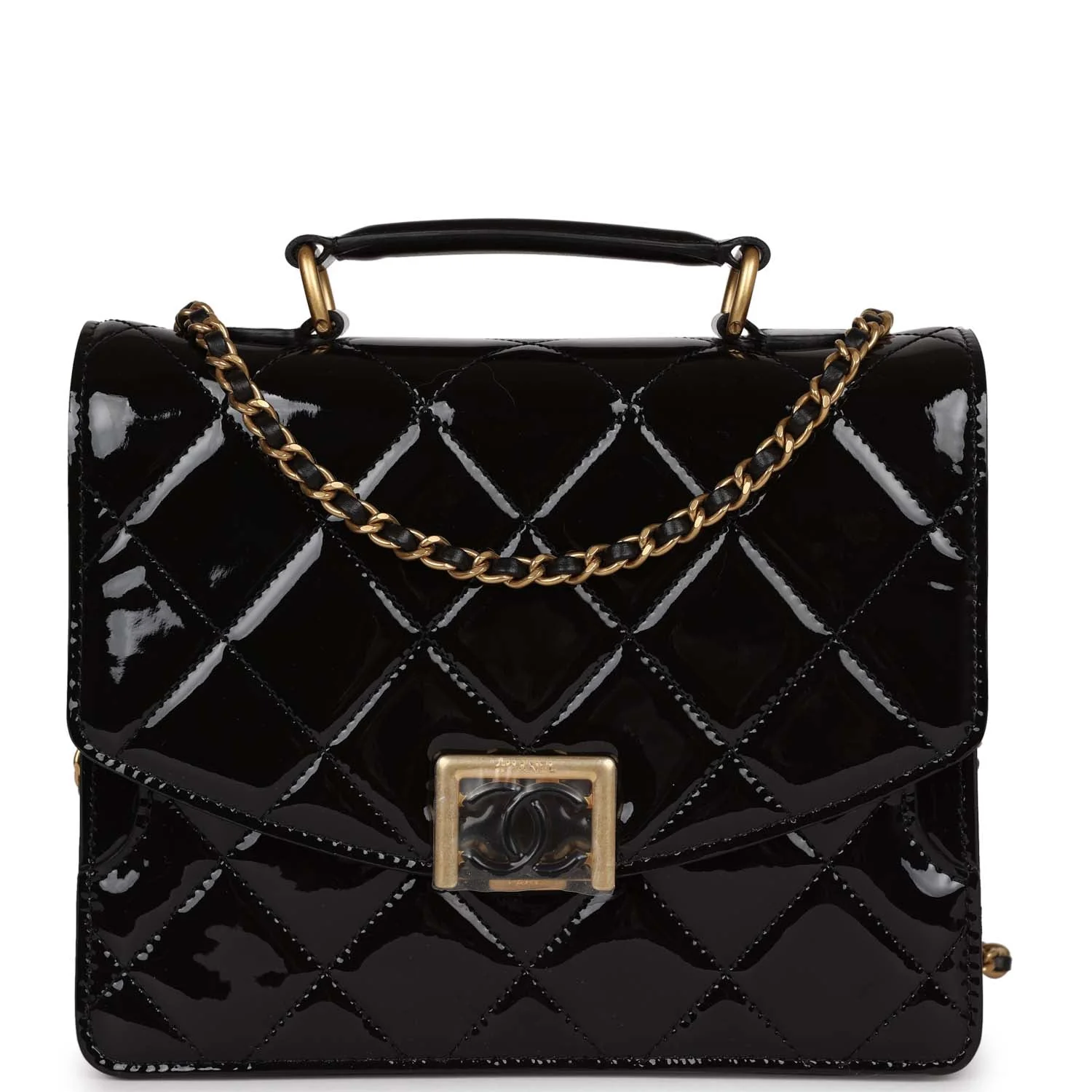 Chanel Accordion Pushlock Top Handle Flap Bag Black Patent Leather Aged Gold Hardware