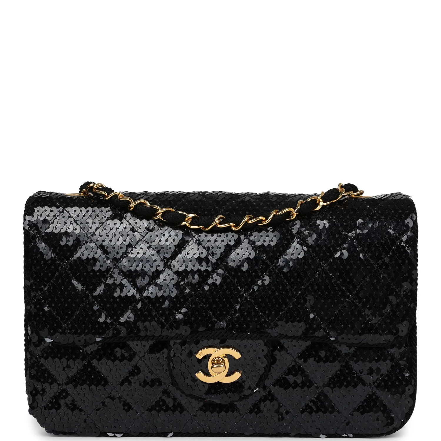 Vintage Chanel Small Flap Bag Black Sequin Gold Hardware
