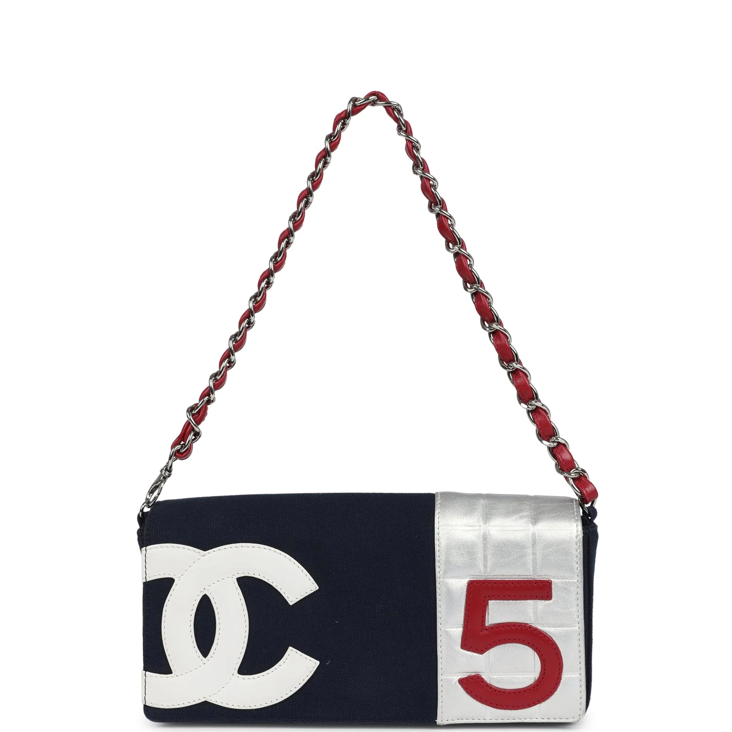 Vintage Chanel N0.5 Chain Shoulder Bag Navy, Silver, Red Canvas Silver Hardware