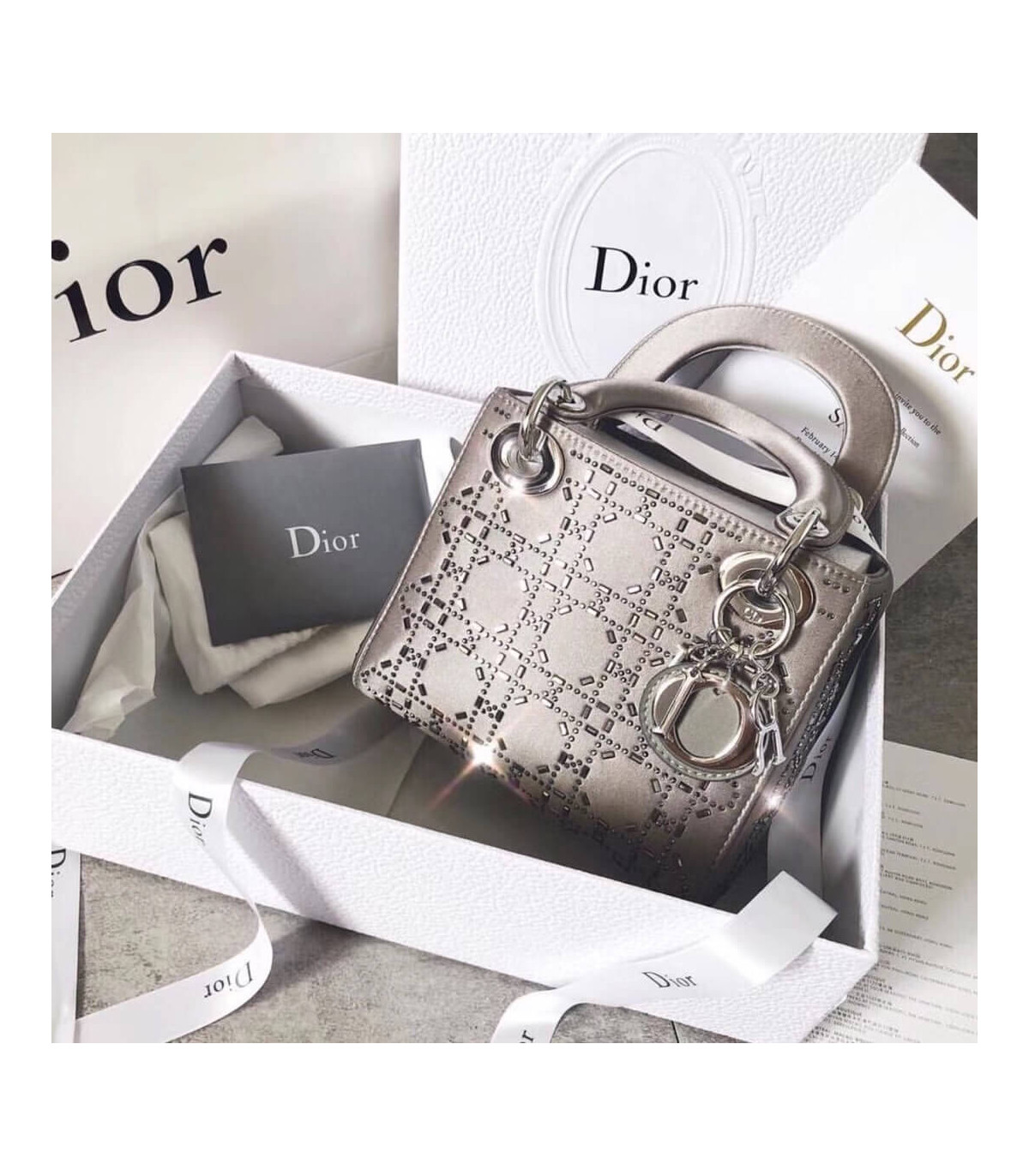 Dior Christian Dior Mini Lady Dior Bag Metallic Calfskin with Platinum Beaded Cannage Embroidery