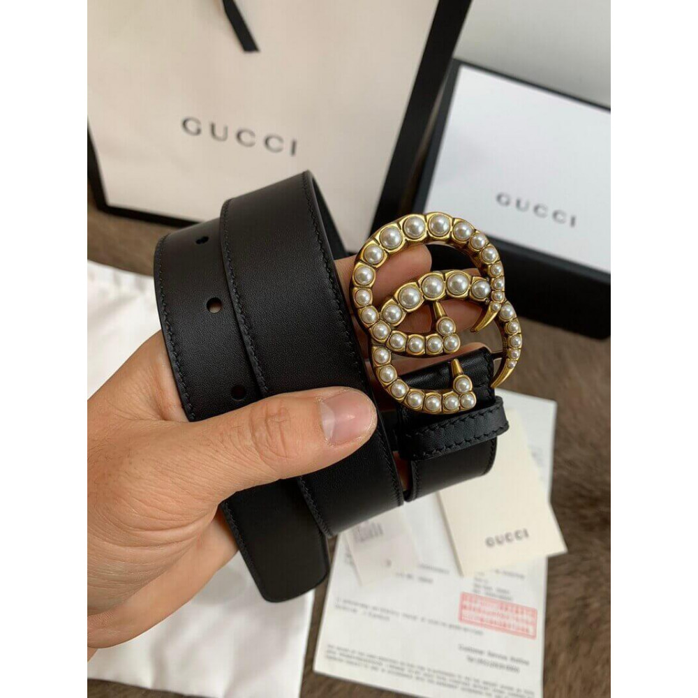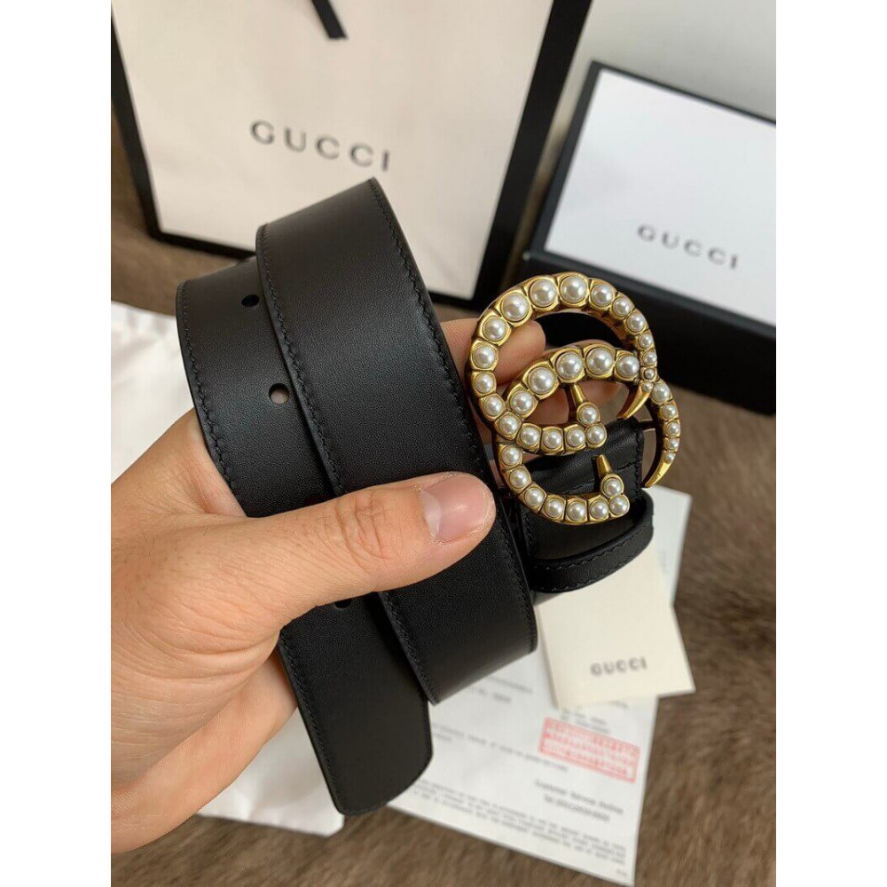 Gucci Black Leather 30mm Belt With Pearl Double G