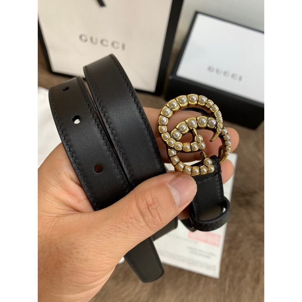 Gucci Black Leather 20mm Belt With Pearl Double G